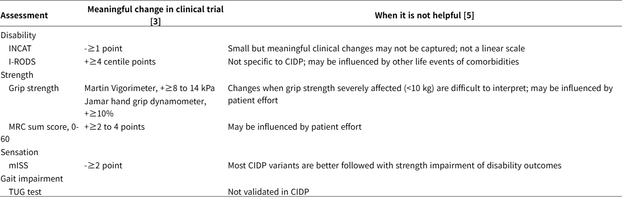 이와 같이 증상이 호전되어 치료제를 감량하거나 축삭 손상에 의한 증상으로 더 이상 과도한 치료가 효과가 없음을 판정하기 위해서는 치료 효과에 대한 객관적인 지표가 필요하다. 그러나 CIDP는 치료 효과나 예후를 예측할 수 있는 생물표지자가 없기 때문에 현재까지는 신체 진찰을 이용한 객관적인 지표가 주로 이용되고 있다[3,5]. Table은 주요 연구에서 사용하고 있는 지표들을 정리한 것이다.