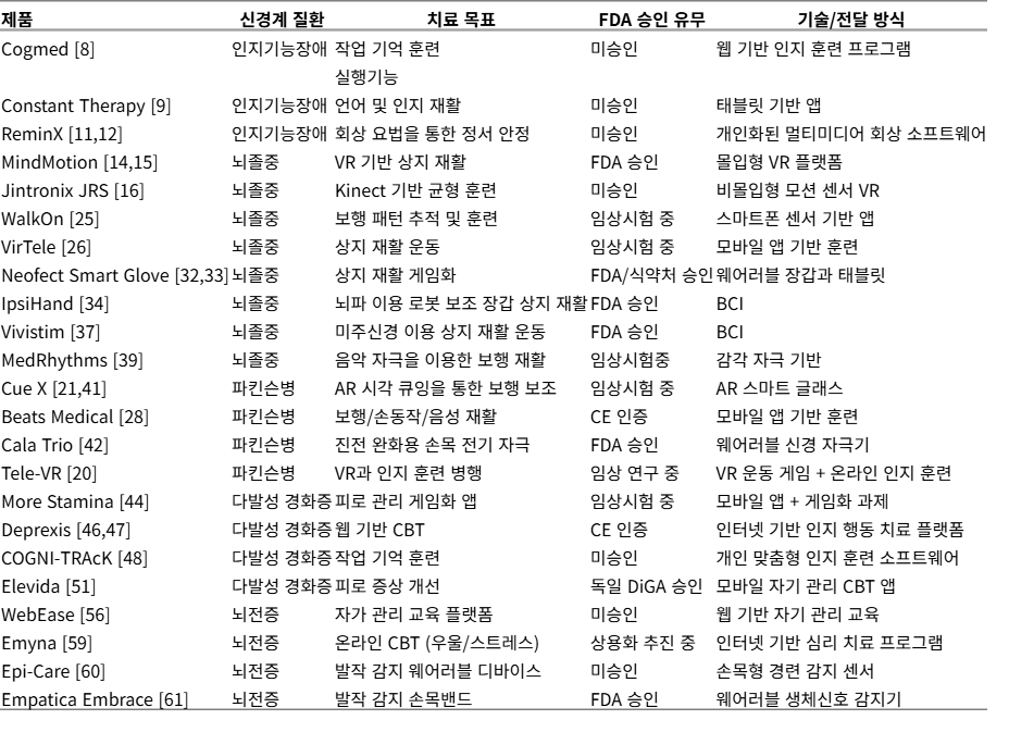 요약하면 VR/AR, 모바일 앱, 웨어러블/신경 기술을 포함한 다양한 형태의 DTx가 뇌졸중과 파킨슨병 환자의 운동기능, 감각기능, 균형기능 회복을 위하여 개발되어 왔으며 다수는 임상 시험을 통해 전통 재활과 비슷하거나 그 이상의 효과를 입증하고 있다[5,20].