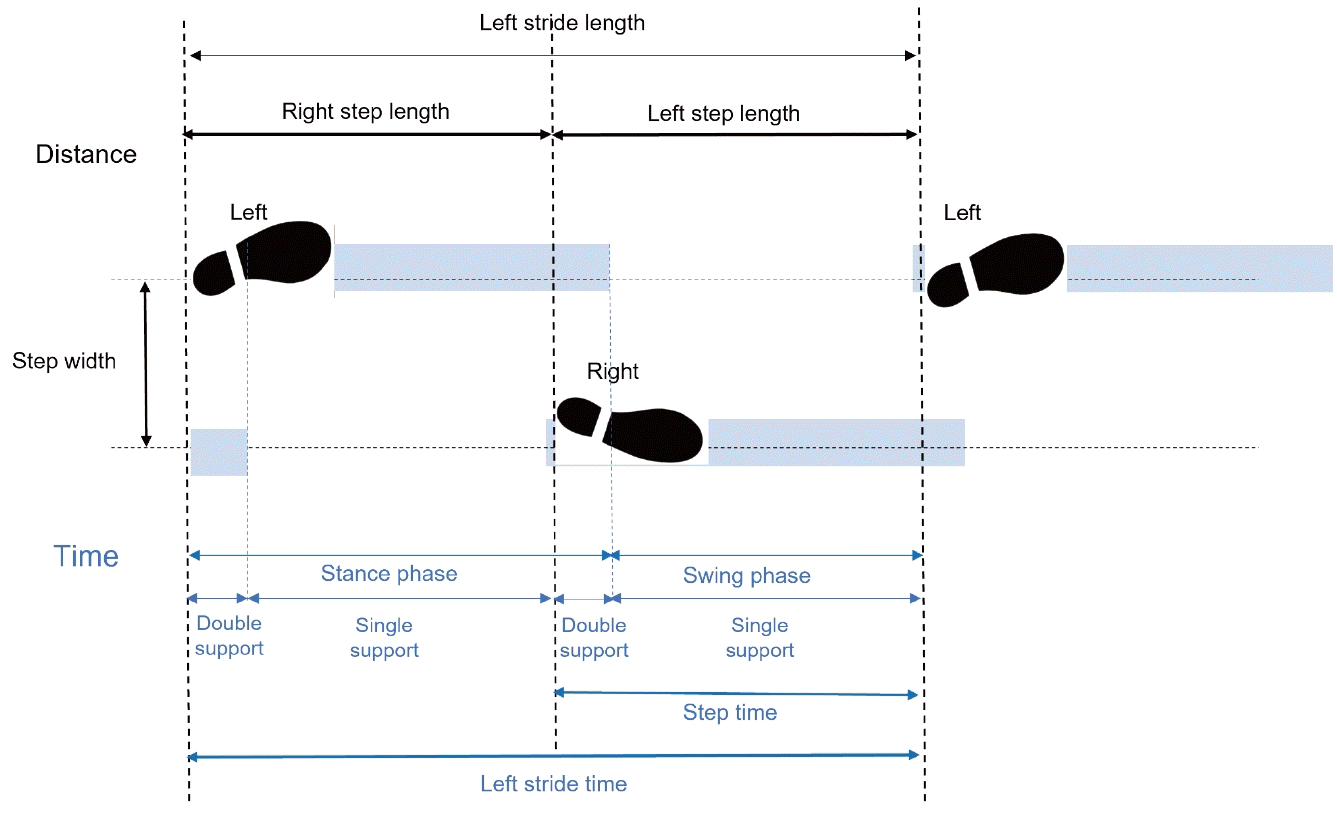 보행 박자(cadence)는 1분당 걸음 수를 의미한다. 보행 속도(gait speed)는 보행 거리를 시간으로 나눈 값이다. 활보 시간(stride time, gait cycle time)은 같은 발의 두 연속적인 지면 접촉 사이의 시간을 뜻한다. 보폭 시간(step time)은 한쪽 발걸음의 시간이다. 디딤기(stance phase)는 발이 지면에 닿아 체중을 지지하는 단계로 값을 퍼센트(%)로 표기한다. 흔듦기(swing phase)는 발이 지면에서 떨어져 앞으로 나아가는 단계이며 이중 지지기(double support)는 일 보행주기 중 두 발이 동시에 지면에 접촉하고 있는 기간의 비율을 뜻한다. 흔듦기와 이중 지지기 역시 퍼센트(%)로 값을 표기한다.
