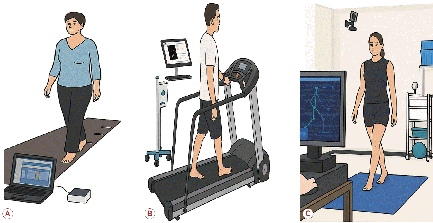 2025년 현재 인정 비급여로 처방 가능하며 국내에서 처방할 수 있는 보행 분석 기기는 광학 기반 3차원 동작 분석과 압력 센서 기반 보행 분석의 두 가지이며 압력 센서 기반은 매트를 걷는 보행로 방식과 트레드밀을 걷는 방식으로 나누어진다. 특히 압력 센서 기반 보행로 보행 분석의 경우 광학 기반 3차원 동작 분석에 비해 비용이 저렴하고 접이식으로 좁은 공간에서도 측정이 가능하여 상급종합병원뿐 아니라 일반종합병원에서도 쉽게 수행할 수 있어 많이 보급되고 있다. 이러한 보행 분석 기기의 발달로 앞으로 보행 분석에 대한 수요는 계속 증가할 것으로 예상되나 신경계 질환에서 어떻게 적용하는지, 어떻게 결과를 해석하고 판독하는지, 실제 임상에서 어떻게 처방하는지 등 근거 기반의 진료지침이 없는 실정이다. 국외에서는 보행 분석의 임상적 적용에 대한 많은 논문들이 출판되어 왔으나 활용되는 기기가 나라마다 다르고 보험 체계도 상이하며 임상적인 가이드보다는 연구 목적으로 진행된 논문들이 많아 국내 임상 현장에서 진료용으로 활용하기에는 제한점이 있다[4]. 본 종설에서는 신경계 질환에서 보행 분석의 병태생리적 기초와 임상 적용에 대해 고찰하고 다양한 분석 기술과 그 임상적 유용성에 대해 최근의 문헌과 연구를 중심으로 통합적 관점을 제시하고자 한다. 특히 2025년 기준 국내에서 허가되어 처방 가능한 보행 분석별 특징을 요약하여 임상 현장에서 적용할 때 도움이 되고자 한다.