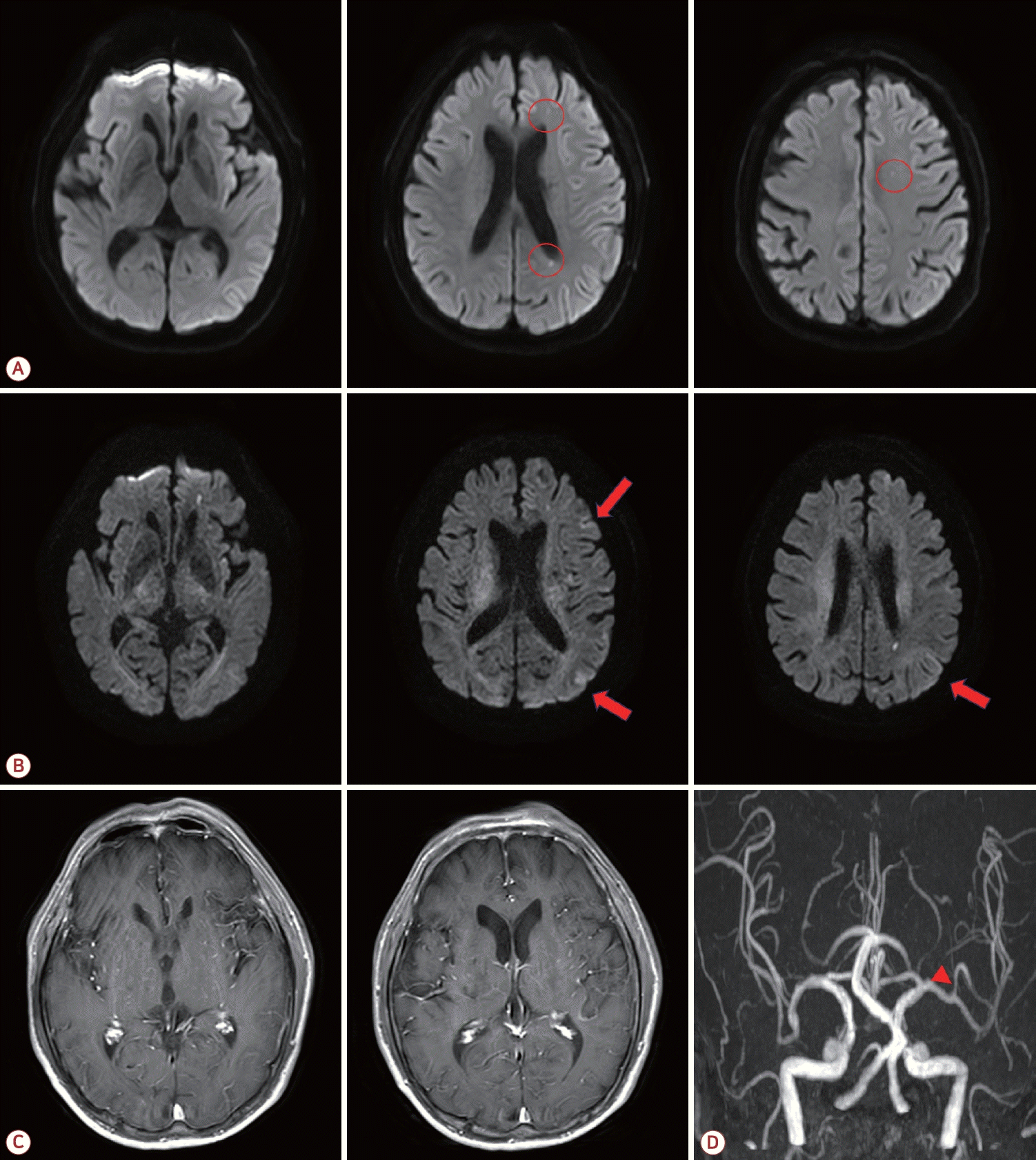 증상 발생 4시간 40분에 추가로 진행된 확산강조영상에서 처음 확인된 뇌병변 이외에 대뇌 피질을 따라 고신호 병변이 추가로 확인되었다(Fig. B). T1 조영증강영상에서 뚜렷한 연수막 조영증강은 확인되지 않았다(Fig. C). 한달 전 뇌수막염으로 입원하여 진행한 뇌혈관영상과 비교하여 경미한 좌측 중대뇌동맥 위분지에 동맥경화가 악화 없이 확인되었다(Fig. D).