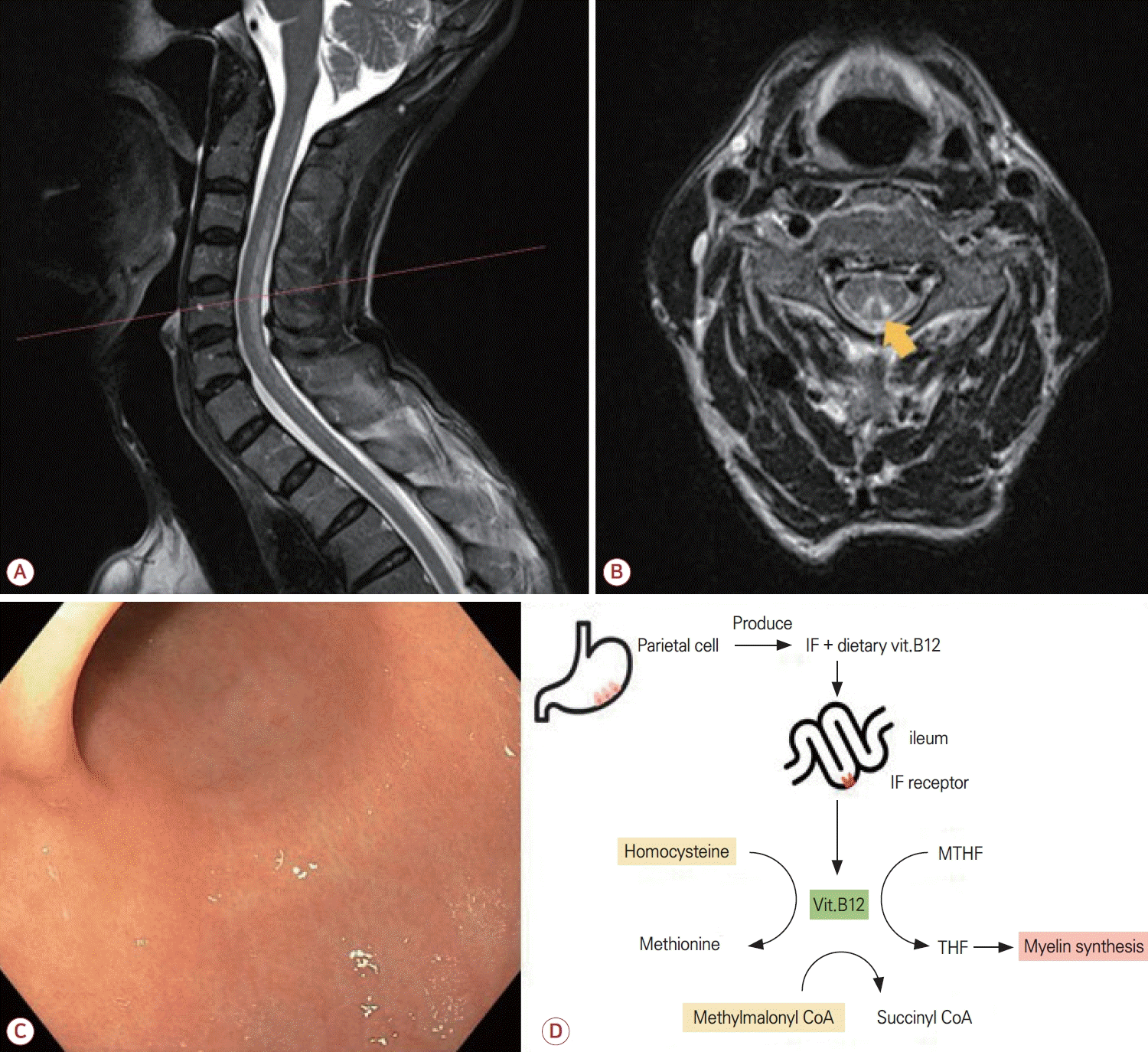몸감각유발전위(somatosensory evoked potential, SSEP) 검사에서는 양측 정중신경(median nerve)의 중심전도로 지연이 확인되었고 양측 정강신경(tibial nerve)에서도 전도 이상이 의심되었다. 척수 자기공명영상(magnetic resonance imaging, MRI)에서는 경추 및 흉추의 뒤기둥에 고신호병터가 확인되었고(Fig. A) 가로횡단면에서 뒤집힌 V징후(inverted V sign)가 관찰되었다(Fig. B). 상부위장관내시경에서는 만성 위염 소견만 관찰되었으며(Fig. C) 조직 검사에서도 만성 위염이 확인되었다. 헬리코박터균(Helicobacter pylori)에 대한 중합효소사슬반응(polymerase chain reaction, PCR)은 음성이었고 혈청 가스트린(gastrin)은 575 pg/mL (정상, 13-115)로 상승되어 있었다. 위벽세포항체(anti-parietal cell antibodies)는 음성이었으나 내인자(intrinsic factor, IF)항체는 양성이었다. 위점막 생검에서는 모든 부위에서 만성 위축위염 소견이 보였고 위바닥(fundus)에서는 위오목증식(foveolar hyperplasia)이, 위몸통(mid body)에서는 위오목증식 및 장상피화생(intestinal metaplasia)이 추가적으로 관찰되었다. 소화기내과 협진을 통해 AIG가 고려된다는 답변을 받았으며 신경계 진찰과 영상 및 혈청 검사 소견을 종합하여 AIG로 인한 비타민B12 결핍에 의한 SCD로 진단하였다.