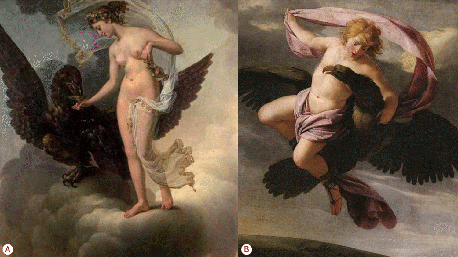 기원전 8세기부터 문학적으로 형성되어 로마제국 시대까지 발전되고 널리 알려져 있던 그리스・로마 신화에서 신들은 대체로 젊고 완전무결한 모습으로 묘사되었다(Fig. 1). 그러나 노화를 상징하는 신 게라스(Geras)는 등이 굽은 노인의 형상으로 노화를 누구도 피할 수 없는 숙명으로 표현하였다(Fig. 2). 반대로 청춘의 여신 헤베(Hebe)와 가니메데(Ganymede)는 불멸의 음식 넥타르(Nectar)와 암브로시아(Ambrosia)를 관리하여 신들이 늙지 않도록 하였다(Fig. 3). 티토노스(Tithonos)신화는 영생을 얻었으나 젊음을 얻지 못해 끝없이 늙어가는 인간의 비극을 보여주며[14] 아폴론 신에게 영생을 바랐던 쿠마에(Cumaen) 무녀 시빌라(Sibyl)는 영원한 젊음을 함께 바라는 것을 잊었기에 죽지 못한 채 계속 노쇠하여 결국에는 육체를 잃고 목소리만 남았다[15]. 반대로 네스토르(Nestor)는 노년의 지혜와 언변으로 그리스 군을 이끌며 존경을 받았다[16].