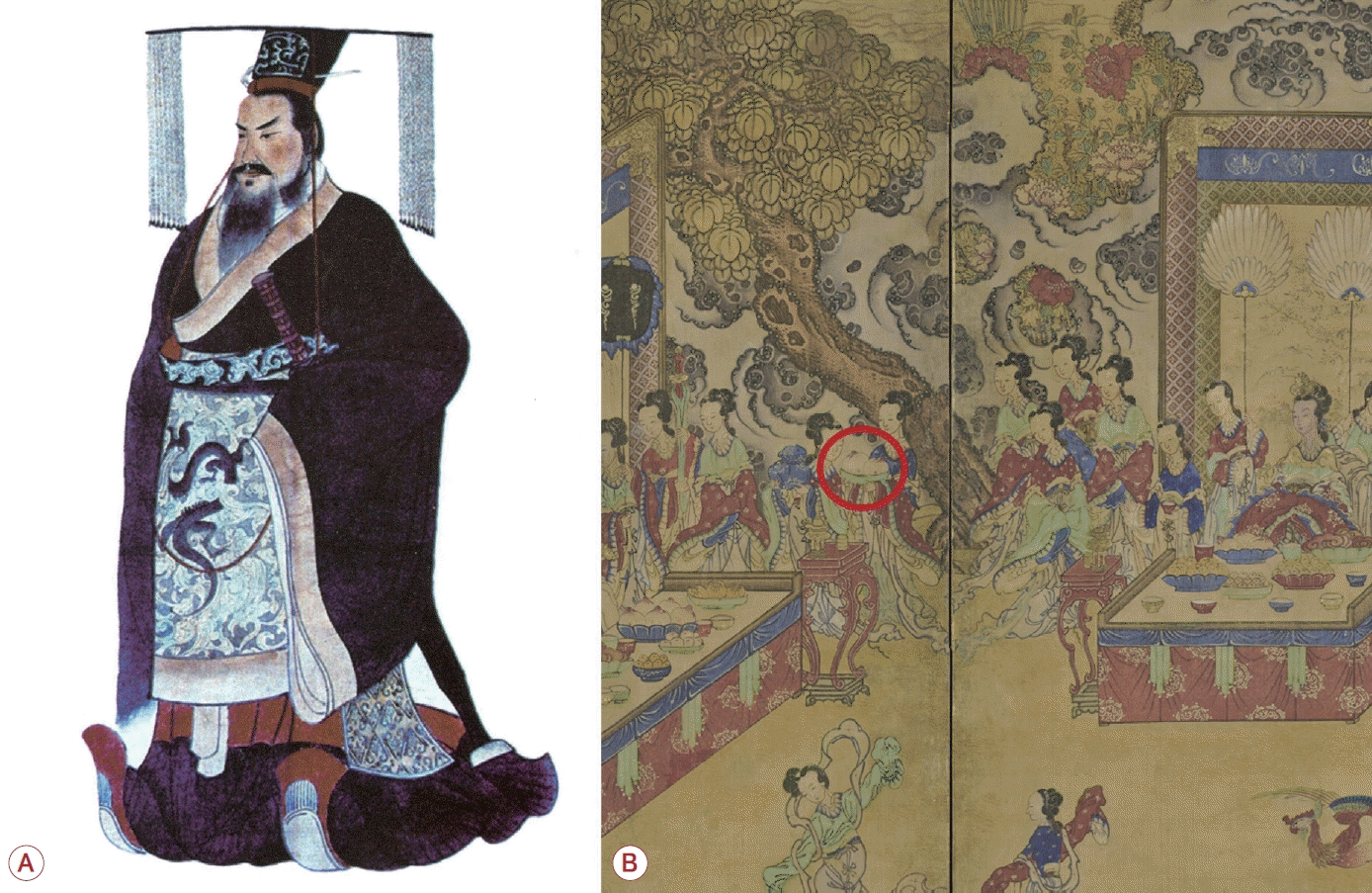 유교 문화권에서는 효 사상이 노인 존중을 제도화하였으나 기근과 전란 속에서는 노인이 우선 희생되기도 하였다. 동시에 불로초를 얻고자 하던 진시황(Fig. 5-A)이나 서왕모의 복숭아(Fig. 5-B), 동방삭의 장수 전설이 장수에 대한 열망을 반영하였다. 일본의 기로(棄老) 설화는 노화를 사회적 부담으로 본 극단적 사례였다.