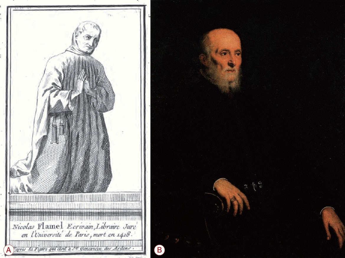 유럽 중세에서는 젊음의 샘(Fountain of Youth) 전설이 널리 퍼졌으며[19-21] 연금술은 불멸의 엘릭서(Elixir)와 현자의 돌(Philosopher’s Stone)을 추구하였으나 실질적 성과는 없었다(Fig. 6-A) [22]. 중국 연단술도 불로장생을 꿈꾸었으나 수은 등 독성 물질로 인하여 황제들이 조기 사망하는 경우가 많았다[23]. 르네상스 시대인 1558년에 쓰인 루이지(Luigi)의 The Art of Living Long은 절제와 균형 있는 생활이 장수의 비결임을 강조하며 오랫동안 장수의 교본으로 읽혔다(Fig. 6-B) [24,25].