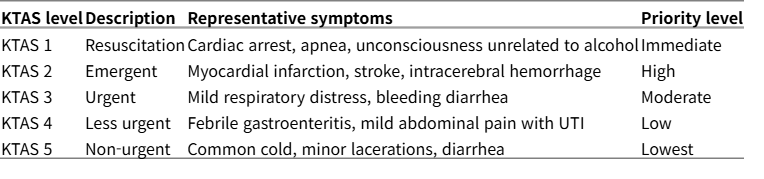 이러한 맥락에서 응급 의료는 급성기 뇌졸중 환자의 치료 지연 여부를 결정짓는 핵 심 단계로 효과적인 자원 활용과 신속한 의사결정이 환자의 치료 결과를 최적화하고 체계 전반의 효율성을 높이는 데 필수적이다[10,11]. 특히 응급실 단계에서 이루어지는 중증도 분류(triage)는 환자의 진료 우선순위를 정하고 적절한 시점에 중증 환자에게 치료를 제공하며 불필요한 지연을 최소화하는 데 중요하다[12]. 뇌졸중과 같이 시간 의 존적 질환에서는 triage 결과에 따라 혈관재개통 치료, 집중 감시, 추가 영상 검사 등 의 자원 배분이 달라질 수 있다[12]. 따라서 응급실 도착 이후 이루어지는 triage 분류와 초기 치료 과정은 급성기 뇌졸중 환자의 예후를 결정짓는 핵심 단계이다.