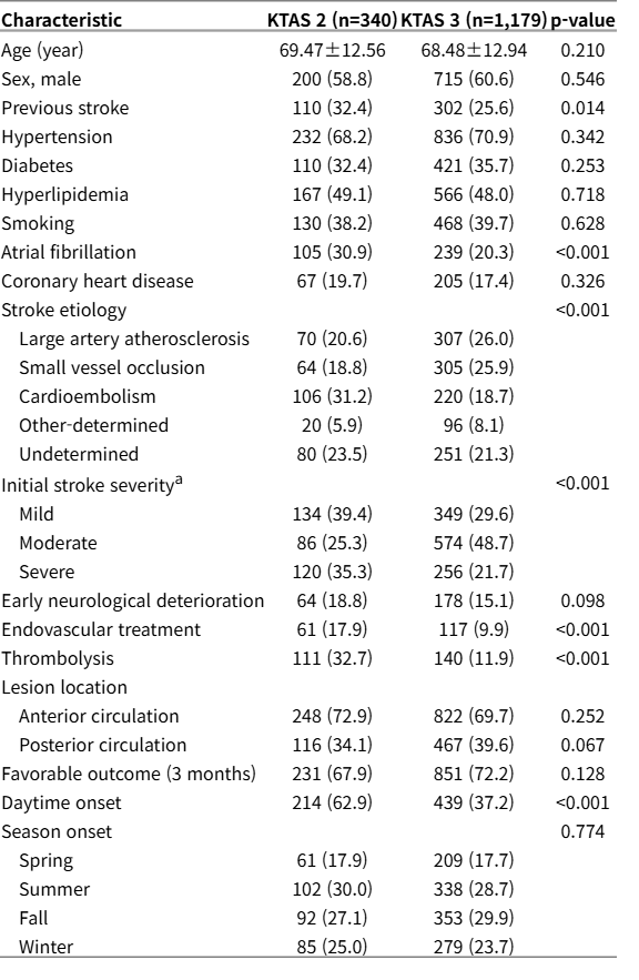총 1,519명의 대상자가 본 연구에 포함되었다. 연구에 포함된 환자들의 평균 연령은 68.7세였으며 남성은 915명(60.2%)이었다. 주요 뇌졸중 위험인자인 고혈압은 1,068명(70.3%), 당뇨병은 531명(35.0%), 이상지질혈증은 733명(48.3%), 심방세동은 344명(22.6%)에서 관찰되었다. TOAST 분류에 따르면 CE가 326명(21.5%)으로 가장 두드러졌고 LAA는 377명(24.8%), SVO는 369명(24.3%)이었다. 3개월 후 양호한 예후는 전체의 71.0%에서 확인되었다. KTAS 분류 기준으로 KTAS 2등급은 340명(22.4%), KTAS 3등급은 1,179명(77.6%)이었다.