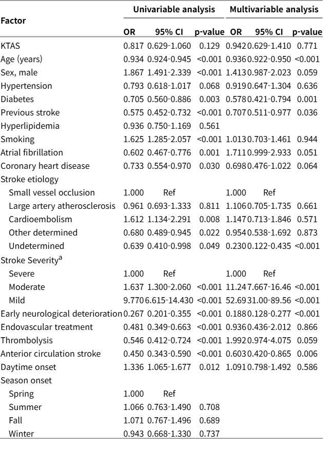 다변량 로지스틱 회귀분석에서 KTAS 등급은 3개월 기능적 예후와 유의한 관련성을 보이지 않았다(adjusted OR, 0.94; p=0.77). 반면 연령 증가와 더 높은 초기 NIH 뇌졸중 척도는 일관되게 양호한 예후의 감소와 독립적으로 연관되었다. 또한 당뇨병, 이전 뇌졸중 병력, 원인 불명 뇌졸중(TOAST UD)은 양호한 예후(favorable outcome)의 낮은 확률과 관련되었다. 경증 및 중등도 NIH 뇌졸중 척도 범주는 중증군에 비해 각각 약 53배와 11배 높은 양호한 예후 가능성을 보였으며 END의 발생은 예후 악화와 강하게 관련되었다. 전방순환계 뇌경색은 후방순환계에 비해 불량한 예후와 독립적으로 연관되었다. 재관류 치료는 단변량 분석에서는 유리한 효과를 보였으나 다변량 분석에서는 독립적 연관성이 소실되었다. 요약하면 본 연구에서 3개월 기능적 예후는 초기 신경계 중증도와 기저 질환, END 발생 여부에 의하여 결정되었으며 KTAS 등급은 예후를 예측하는 유의한 요인이 아니었다(Table 3). 동일한 분석을 3개월 mRS 0-1을 양호한 예후로 정의하여 수행한 민감도 분석에서도 주요 결과는 변하지 않았다(Supplementary Table 1). 또한 3개월 mRS 전 범위(0-6)를 결과 변수로 한 순서형 로지스틱 회귀분석에서도 연령, 초기 NIH 뇌졸중 척도, 조기 신경계 악화 등 주요 예후 결정 인자는 일관되게 유지되었다(Supplementary Table 2).