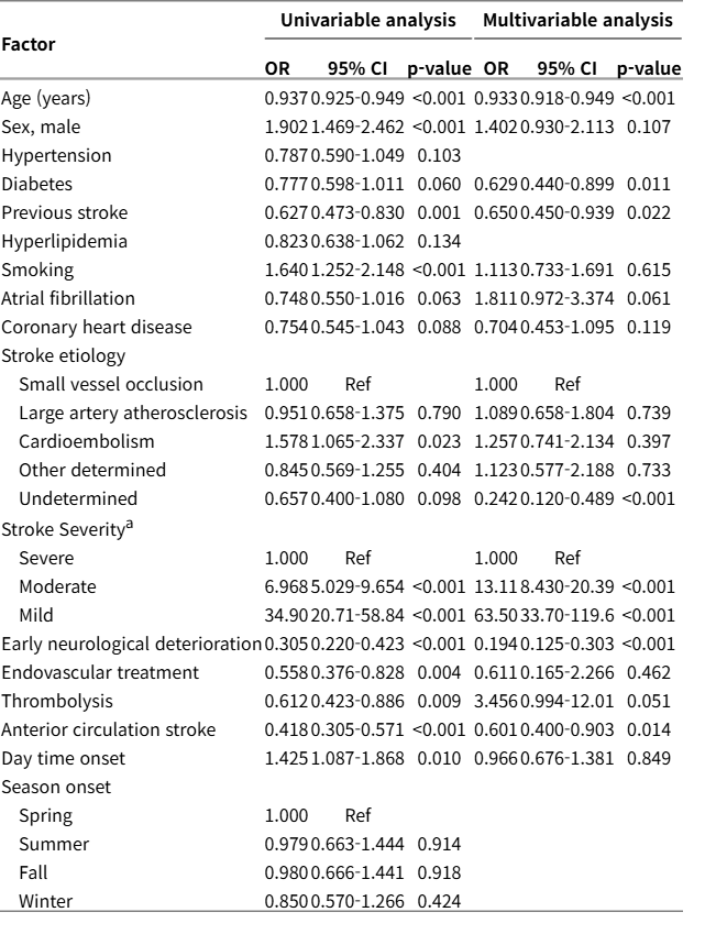 Multivariable proportional-odds logistic regression analysis of 3-month functional outcomes (mRS, 0-6)