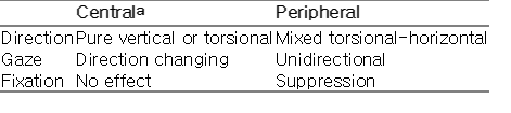 안진을 검사할 때는 우선 안진의 방향, 정도, 주시 방향에 따른 변화를 면밀하게 관찰하여야 한다[10]. 한쪽의 말초병변(내이 또는 전정신경 병변)에서는 양안이 서서히 병변 쪽으로 치우치며(서상), 이를 보상하려는 신속운동(속상)은 병변의 반대편을 향한다. 일측 말초병변에서는 병변의 반대편을 향하는 회선-수평안진(torsional-horizontal nystagmus)이 관찰된다. 중추안진은 다양하게 나타날 수 있다. 순수한 수직 방향의 안진이나 회선안진은 중추 병변을 시사한다. 또한 안진의 방향이 불규칙하거나, 시선에 따라 안진의 방향이 바뀌는 주시안진(gaze-evoked nystagmus)도 중추안진이다. 일반적으로 안진은 안진의 방향 쪽을 쳐다볼 때 정도가 증가하며, 시선이 반대 방향을 향할 때는 감소하는 경향을 보인다(Alexander법칙). 말초안진에서는 주시 방향에 의해 안진의 강도가 변할 수는 있으나 방향이 역전되지는 않는다. 말초전정기능장애에서는 원활추종운동(smooth pursuit)이 정상이므로 시선고정(fixation)에 의해 안진이 억제되는 경향을 보인다. 시선고정을 제거하고 안진의 양상을 좀 더 정확히 관찰하기 위해 검안경(ophthalmoscope)이나 Frenzel안경을 사용할 수 있다. Frenzel안경은 20-30 디옵터 볼록렌즈를 장착한 특수 안경으로 환자의 시선고정을 막는 역할을 한다. 또한 볼록렌즈가 눈의 움직임을 확대시켜 보여주므로 안진의 관찰이 용이하다. 말초 및 중추 안진의 일반적인 감별점은 표에서와 같다(Table 1). 이 외에도 잠재되어 있는 전정기능의 불균형을 유발하기 위해 두진(head shaking), 과호흡(hyperventilation), 체위변환(positioning) 등 다양한 방법이 이용될 수 있다[10].