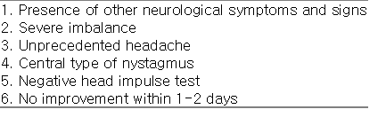 진단에는 고혈압, 당뇨병, 고지혈증, 흡연, 과음, 심장질환과 같은 뇌졸중의 위험인자가 있는지 여부와, 뇌간이나 소뇌를 공급하는 척추기저동맥계의 병변에서 흔히 관찰되는 반신 또는 사지마비, 감각장애, 시야장애, 복시, 안면마비, 구음장애, 삼킴 곤란, 실조 등의 동반 증상 유무가 중요하다. 어지럼이 다른 신경학적 증상들과 동반된 경우는 쉽게 뇌졸중으로 진단할 수 있다. 그러나 어지럼이 단독으로 발생하는 경우는 자세한 병력 및 신경과적 진찰을 통하여 어지럼이 뇌간 부위로 가는 혈류의 장애에 의한 것인지를 감별해 주어야 한다. 특히 내이동맥(labyrinthine artery)만이 선택적으로 침범되거나 하부 소뇌 부위의 경색은 다른 증상 없이 어지럼과 자세불안만을 발생시킬 수 있으므로 주의하여야 한다. 급성자발현훈 환자에서 중추 병변이 의심되어 뇌촬영이 필요한 경우는 표에서와 같다(Table 2)[16-18].