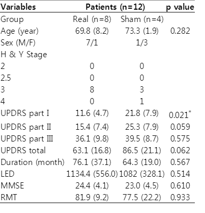 총 15명의 환자가 등록되었다. 실제자극그룹에는 두 명의 환자가 프로토콜 위반으로 탈락되었다. 한 환자는 6주차 추적조사에 나오지 않아서 10일 자극 후의 결과만 사용하였다. 거짓치료 그룹에서 한 명은 자기자극치료의 불분명한 효과로 인해 중도 포기하였다. 최종 분석은 총 12명의 환자 데이터를 사용하였다(Fig. 1). 경두개 자기자극 치료를 하면서 그리고 추적조사 기간에서 어떤 부작용도 발견되지 않았다. 평균 UPDRS part I, II, III 그리고 총점은 거짓치료그룹에서 약간 높았으나 통계적인 차이는 없었으며, 두 군에서 다른 기본 특성들은 동일했다(Table 1).