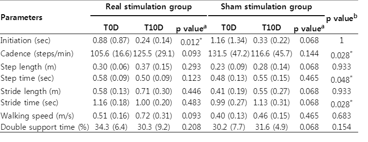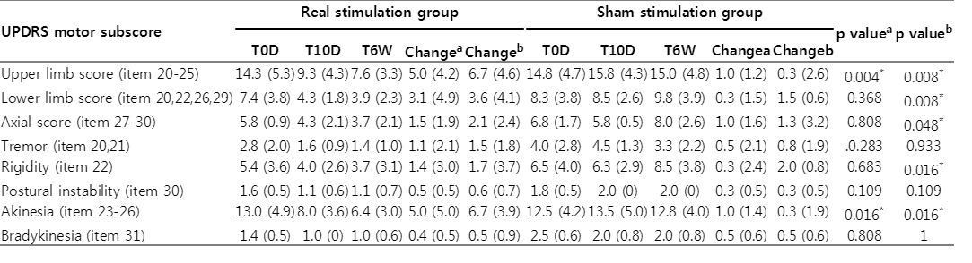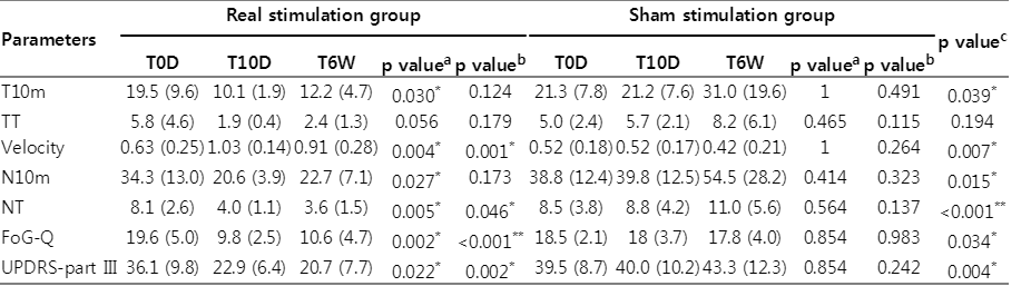 실제자극그룹에서 T10m, velocity, N10m, NT, FoG-Q 및 UPDRS-part III 점수는 10일간 반복적 경두개자기자극을 시행한 후 유의하게 호전되었다(p=0.030, 0.004, 0.027, 0.005, 0.002, 0.022). 또한 velocity, NT, FoG-Q 및 UPDRS-part III 점수는 6주까지 호전된 상태로 유지되었다(p=0.001, 0.046, 0.000, 0.002). 거짓자극그룹에서는 연구 전 후로 호전된 변수는 없었다. 두 그룹간 분석에선 T10m, velocity, N10m, NT, FoG-Q 및 UPDRS-part III 점수에서 유의한 차이를 보였다(p=0.039, 0.007, 0.015, <0.001, 0.034, 0.004) (Table 2). 또한 10일간이 자극이 끝난 시점(T10D)에서 UPDRS-part III 중 상지(upper limb), 운동불능(akinesia)점수가 유의하게 호전되었다(p=0.004, 0.016). 그리고 상지, 하지(lower limb), 축성(axial), 경직(rigidity) 그리고 운동불능점수 또한 6주 후 추적 조사 시점(T6W)에서도 통계적인 유의성을 보였다(p=0.008, 0.008, 0.048, 0.016, 0.016) (Table 5).