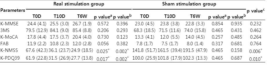 비운동증상은 K-NMSS와 K-PDQ39로 측정하였고, 실제자극그룹에서 자극 후 10일 된 시점(T10D)에서 유의하게 호전되었고(p=0.025, 0.017), 6주 후 추적조사 시점(T6W)에서도(p=0.002, 0.002) 호전을 보였다. 그러나 K-MoCA, FAB 점수에서는 자극 전 후로 차이가 없었다. 거짓자극그룹에서는 자극 전 후로 비운동증상에 차이는 없었다. 두 그룹 간에서 K-NMSS와 K-PDQ39를 비교했을 때 통계적 유의성이 관찰되었다(p=0.006, 0.010) (Table 3).