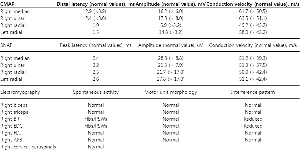 전기진단검사에서 복합근활동전위(compound muscle action potential)와 진폭(amplitude)이 감소하였으나 얕은노감각신경의 감각신경전도검사는 정상이었다. 침근전도검사는 노신경이 지배하는 위팔노근(brachioradialis muscle)과 공통손가락폄근(extensor digitorum communis muscle)에서 자발전위가 보였고 운동단위활동전위(motor unit action potential)는 감소된 간섭양상(reduced interference pattern)이었으나 세갈래근을 포함한 다른 근육은 정상반응이었다. 이러한 전기진단검사 소견은 나선고랑(spiral groove) 부위에 발생한 노신경마비에 합당한 소견이었다(Table 2). 따라서, 병력과 신체검사와 전기진단검사를 바탕으로 남자의 병을 나선고랑 부위에 발생한 압박성 노신경마비로 진단할 수 있었다.