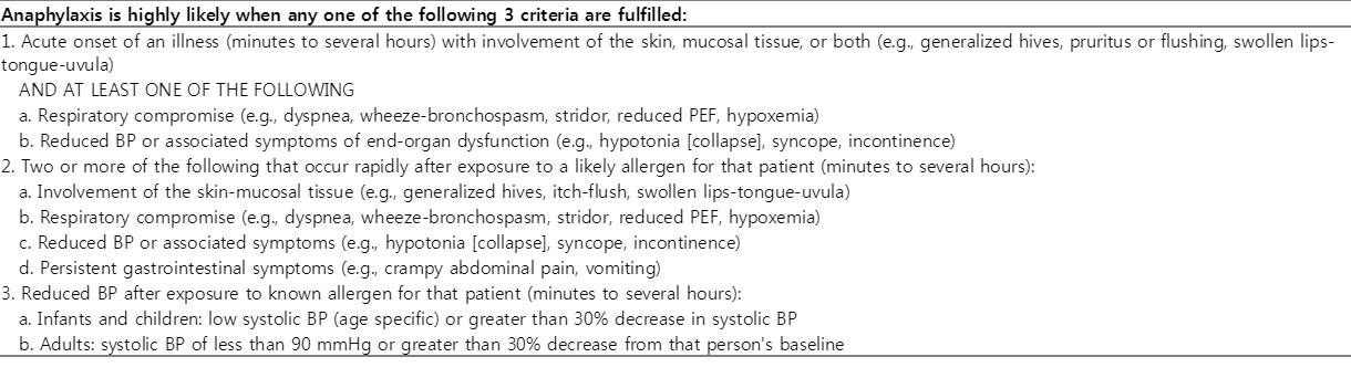 본 증례의 환자의 경우 세 가지 진단기준 중 두 가지를 만족하는 경우로 아나필락시스쇼크로 진단할 수 있다. 아나필락시스가 의심될 경우 즉시 중단 가능한 원인물질을 제거하고 환자의 혈액순환, 기도, 호흡, 의식상태 및 피부 등을 평가하여야 한다. 본 환자의 경우 기도확보를 위하여 기관 삽관 및 산소 투여를 하였고 아나필락시스 치료를 위하여 즉시 에피네프린 및 스테로이드를 투여하였다. 또한 아나필락시스 발생 시 대량의 체액이 혈관 밖으로 빠져나가 혈관내 혈액량 부족이 유발될 수 있으며 활력징후 상 혈액량 부족이 의심될 경우 0.9% 식염수를 즉시 정맥 투여하여야 하는데 이때 과도하게 수액이 주입되지 않도록 하여야 한다[4].