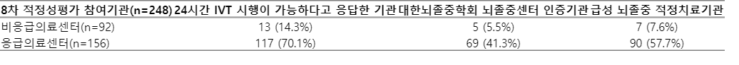 70개 중진료권 중 신경과 또는 신경외과 당직의가 있고 24/7/365 IVT가 가능하다고 응답한 병원이 없는 중진료권은 파주, 이천, 포천, 영월, 동해, 속초, 제천, 공주, 서산, 논산, 홍성, 정읍, 남원, 여수, 나주, 해남, 영광, 영주, 상주, 통영, 거창, 서귀포 등 총 22개(31.4%)였고, 광주광서는 비응급의료센터에서만 가능하다고 답했다.