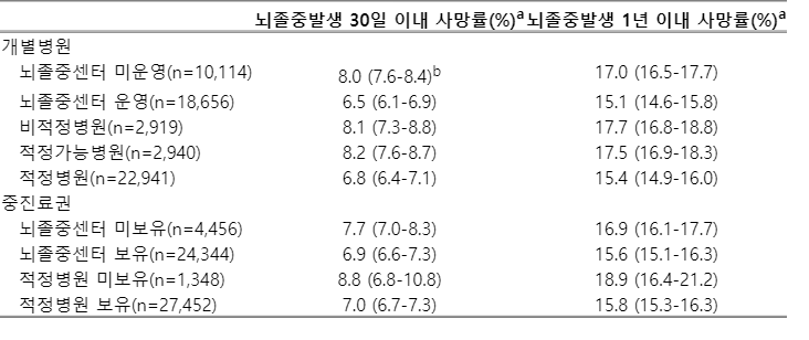 248개 의료기관을 뇌졸중센터 설치 및 적정 의료기관에 따라 나누어 전체 뇌졸중 환자의 발생 30일/1년 이내 사망률을 비교하였을 때, 뇌졸중센터 설치 의료기관 및 적정 기관 모두에서 사망률이 유의하게 낮았다(Table 3). 뇌졸중센터가 있는 중진료권의 사망률은 30일 이내 6.9%, 1년 이내 15.6%로 뇌졸중센터가 없는 중진료권의 7.7%, 16.9%에 비해 낮았으며, 적정 병원이 있는 중진료권의 사망률도 30일 이내 7.1%, 1년 이내 15.7%로 적정 병원이 없는 중진료권의 7.5%, 18.0%보다 낮았다. 또한, 인구 500,000명당 적정 병원 비율이 1 이상인 중진료권은 1 미만인 중진료권에 비해 30일 이내 사망률(7.1% 대 7.5%), 1년 이내 사망률(15.7% 대 18.0%)이 모두 낮았다.