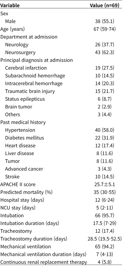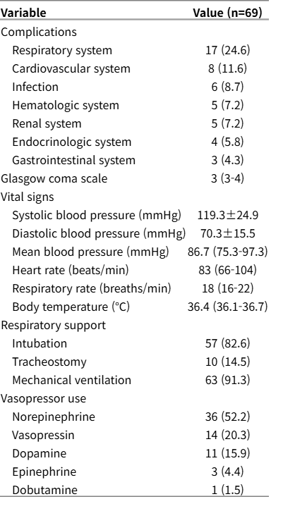 신경계 중환자실 입실 시점의 APACHE II 점수 평균은 25.7±5.1점이었고 예측 사망률 중앙값은 35% (사분위수 범위, 30-55)였다. 전체 병원 재원 기간의 중앙값은 12일, 신경계 중환자실 재원 기간의 중앙값은 5일이었다. 대상 환자 중 66명(96%)에서 기관삽관이, 65명(94%)에서 기계환기가 시행되었다.