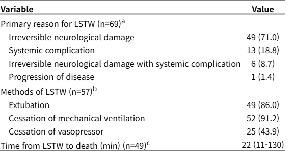 This study was a retrospective analysis conducted at a tertiary university hospital in Busan, South Korea. Among patients admitted to the neurocritical care unit between February 2018 and August 2023, those with documented decisions for LST withdrawal or withholding were enrolled. Demographic and clinical characteristics, underlying and combined conditions, reasons for LST decisions, measures taken, and time from LST withdrawal to death were extracted from medical records.